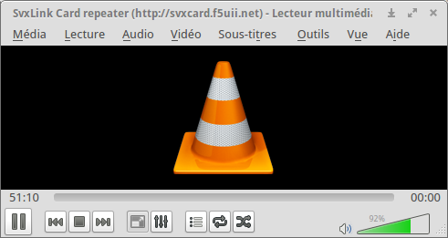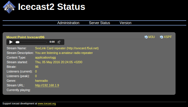 Vous pouvez écouter le flux audio grâce à VLC également en ouvrant l'adresse http://192.168.1.9:8000/svxcard96.xspf